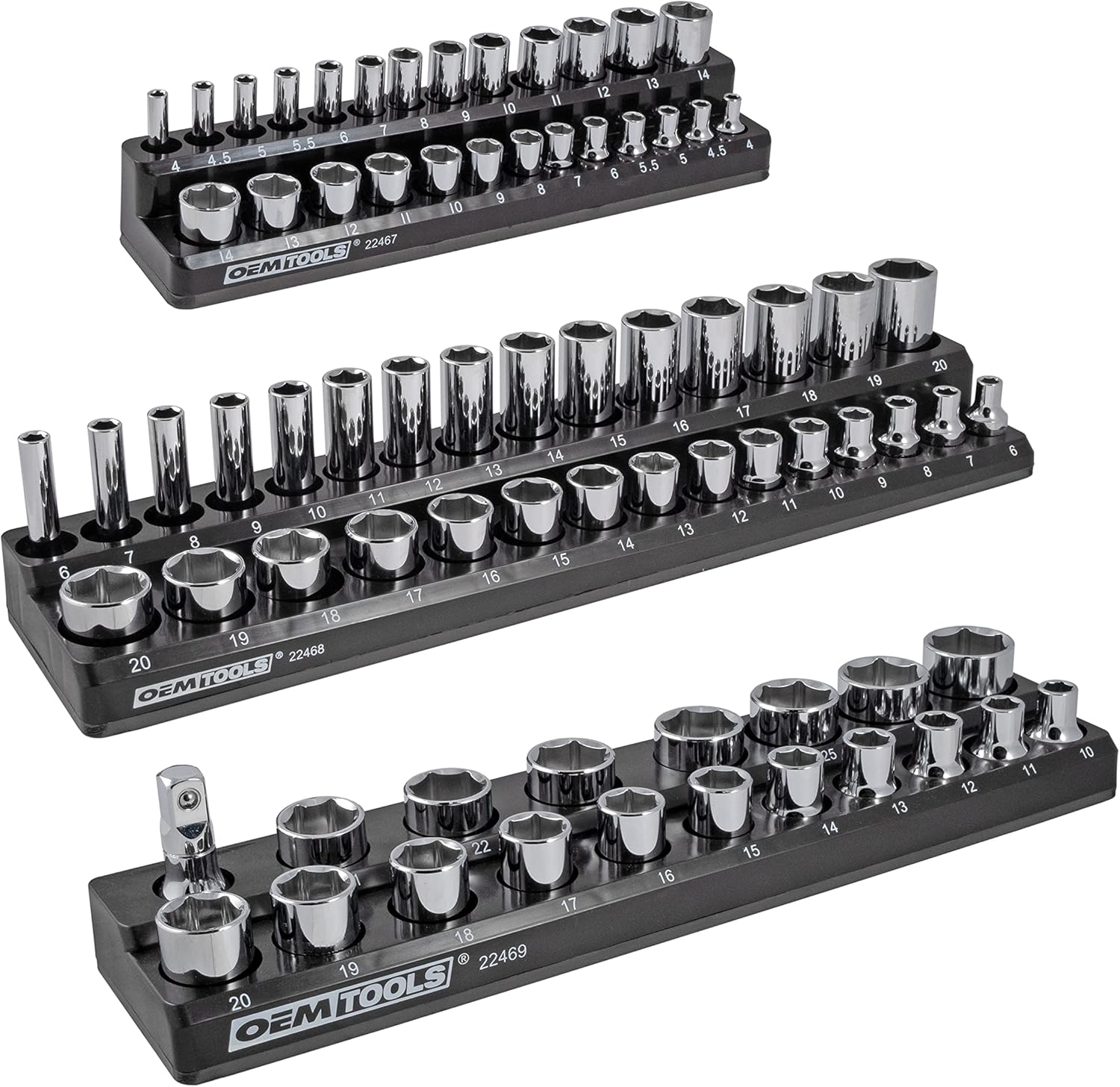 Finding the right socket in a pile or a tool box drawer wastes time you could be spending on automotive or household projects. Wouldn’t it be nice to have socket storage for tool chest drawers and tool boxes that are easily carried and conveniently magnetic? OEMTOOLS 22487 3 Piece Metric Magnetic Socket Organizers have you covered. This set is the best metric socket organizer on the market. Take this socket organizer for toolboxes anywhere. Easily carried, you can stick our strong magnetic socket tray on any ferrous surface. Lifts, rolling carts, tool chests, and more become convenient storage spaces to attach your magnetic socket tray organizer. These magnetic tool box accessories make your sockets more accessible for automotive, electrical, and home maintenance. Our socket trays for tool boxes can even be set upside down without losing sockets. Don’t waste time looking for the right size socket with our socket holders organizers for tool box's easy-to-identify sizing system. Our 3-piece metric socket holder magnetic set comes with 75 slots—a 3/8 socket holder, 1/2 socket organizer, and 1/4 socket organizer. Each mobile socket organizer is a shallow and deep socket holder that easily accommodates to most tool chest drawers. Changing out sockets for your pneumatic ratchets and power tools is quick and easy with the identifiable numbers on the socket holders tray. No need to worry about your 3/8 socket organizer damaging your ferrous metallic surfaces with the OEM TOOLS socket organizer's rubberized backing. The rubberized backing on our magnet socket organizer keeps your surfaces safe from scratches. These socket holders for tool box don’t hold impact sockets. Our metric magnetic socket organizers for toolboxes come in a variety of colors, provided to differentiate metric socket storage from socket organizers metric. Organize your home, shop, or garage efficiently with OEMTOOLS 22487 3 Piece Metric Magnetic Socket Organizers.